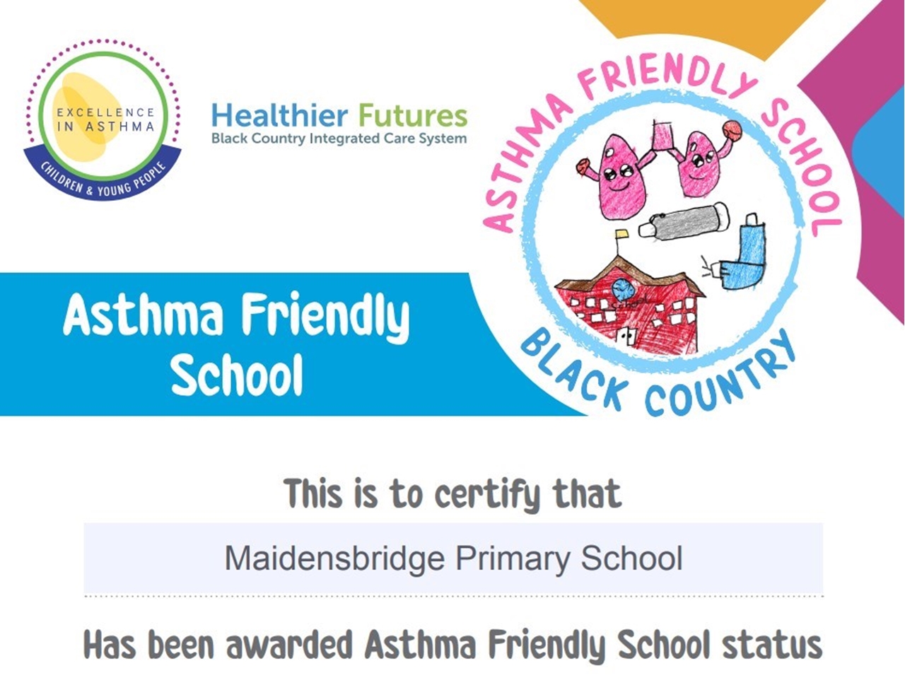 We are very proud to announce that we have been awarded the Asthma Friendly School Award. This involved us explaining how we manage Asthma in our school and our policies and procedures were looked at to ensure we do everything we can to keep children as safe as possible. It also looked at the training that staff have had in managing asthma related incidents. Thank you to Mrs Starkey for coordinating all of this for us and for being grilled by the assessor!