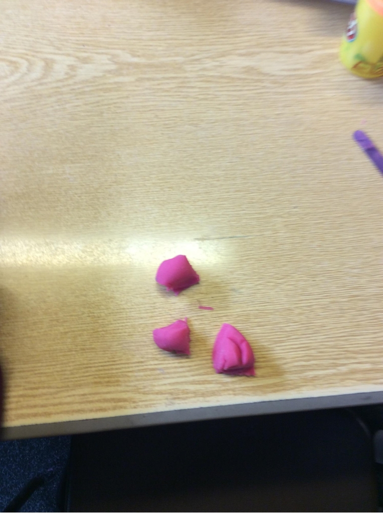 In maths we have been exploring fractions, we used play doh to make a shape. We then thought carefully about how many equal parts we would need to create 1/2 , 1/3 and 1/4.